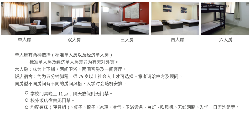 - 房间类型:单人房(标准单人房/经济单人房)双人房、校内校外三人房四人房,六人房,饭店宿舍